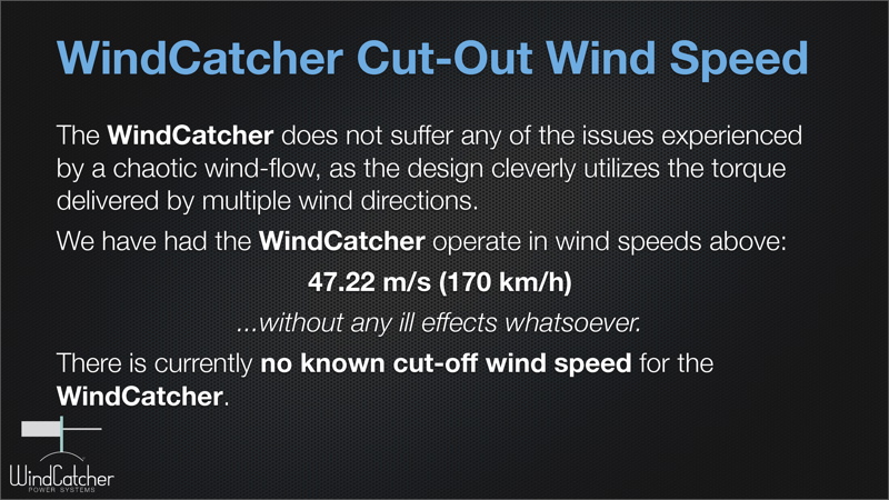 The WindCatcher does not suffer any of the issues experienced by a chaotic wind-flow as the design cleverly utilizes the torque delivered by multiple wind directions. This is why there is currently no known upper cut-off wind speed for the WindCatcher.